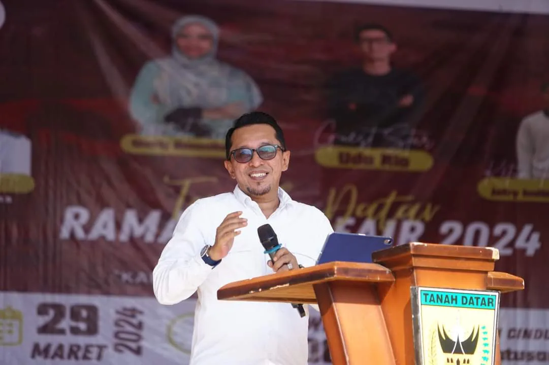 Indocorners.com l Tanah Datar – Bupati Tanah Datar Eka Putra, SE. MM. membuka secara resmi dan sekaligus menjadi keynote speaker di acara Tanah Datar Ramadhan Fair dengan tema Karunia Ramadhan Merajut Asa, yang digelar di lapangan Cindua Mato, Batusangkar, Jumat (29/3/2024).