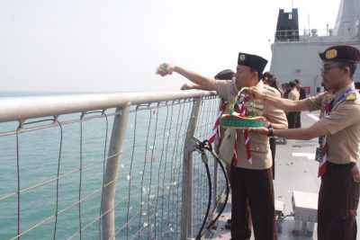 Indocorners.com | Jakarta – Berita Kolinlamil TNI AL – Dalam rangka memperingati Hari Pramuka ke-62 dan Reimuna Nasional XII tahun 2023 dilaksanakan upacara tabur bunga di perairan Teluk Jakarta dengan menggunakan kapal perang jajaran Komando Lintas Laut Militer yaitu KRI Banda Aceh-593, Selasa (15/8/2023). Kegiatan Hari Pramuka ke-62 tahun 2023 ini mengusung tema “Sumber Daya Manusia yang Profesional dan Proporsional”. Acara diawali dengan upacara dan dilanjutkan dengan prosesi tabur bunga dari atas kapal dipimpin oleh Waka Kwarnas Bidang Bela Negara Brigjen TNI (Purn) Hasto Pratisto Yuwono.