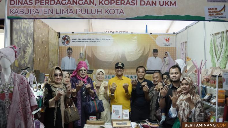 Limapuluh Kota—Tak mau tanggung-tanggung dalam mempromosikan produk unggulannya, Kabupaten Limapuluh Kota memboyong 15 usaha mikro kecil dan menengah (UMKM) dan 20 produk binaan UP3HP (Unit Pelayanan dan Pengembangan Pengolahan Hasil Pertanian) ke ajang pameran “UMKM Sumbar Malagak” di Komplek GOR H. Agus Salim, Padang. UMKM Sumbar Malagak tak lepas dari rangkaian peringatan hari jadi Sumatera Barat ke-77, yang diperingati setiap tanggal 01 Oktober. Iven pameran dibesut Dinas Koperasi dan UKM Sumbar tersebut berlangsung selama empat hari terhitung mulai tanggal 29 September 2022 sampai dengan 02 Oktober 2022. Sejumlah produk unggulan Limapuluh Kota tampak berjejer menghiasi etalase stand Dinas Pedagkop UKM dan Distanhorbun Limapuluh Kota diantaranya Batik Gambir, tenun Kubang, Songket, Rendang, produk olahan ubi dan jagung serta sejumlah produk olahan pertanian lainnya.