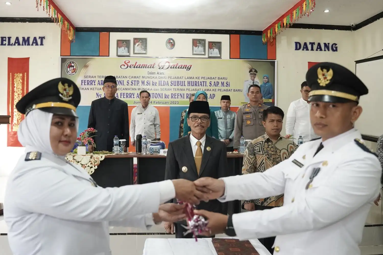 Lima Puluh Kota, Diskominfo — Bupati Limapuluh Kota Safaruddin Dt.Bandaro Rajo bersama Anggota DPRD Limapuluh Kota Yos Sariadi dan Putra Satria Fery menyaksikan Serah Terima Jabatan (Setijab) Pejabat Camat Mungka dari Ferry Aryantoni kepada Ilda Subul Huriati di Aula Kantor Camat Mungka, Jum’at (24/02/2023). Tidak hanya melakukan Sertijab Camat, Ketua TP-PKK Kecamatan Mungka Ny.Refni Renita pada momen yang bersamaan turut dilantik oleh Ketua TP-PKK Limapuluh Kota Nevi Safaruddin. Sertijab Camat dan TP-PKK Kecamatan Mungka juga dihadiri oleh Kabag Pemerintahan Wiradinanta, seluruh camat lingkungan Pemkab Limapuluh Kota, unsur Forkopimda, beserta seluruh Wali Nagari di Kecamatan Mungka.